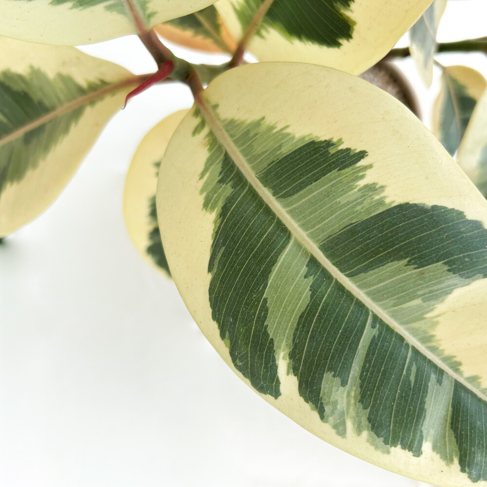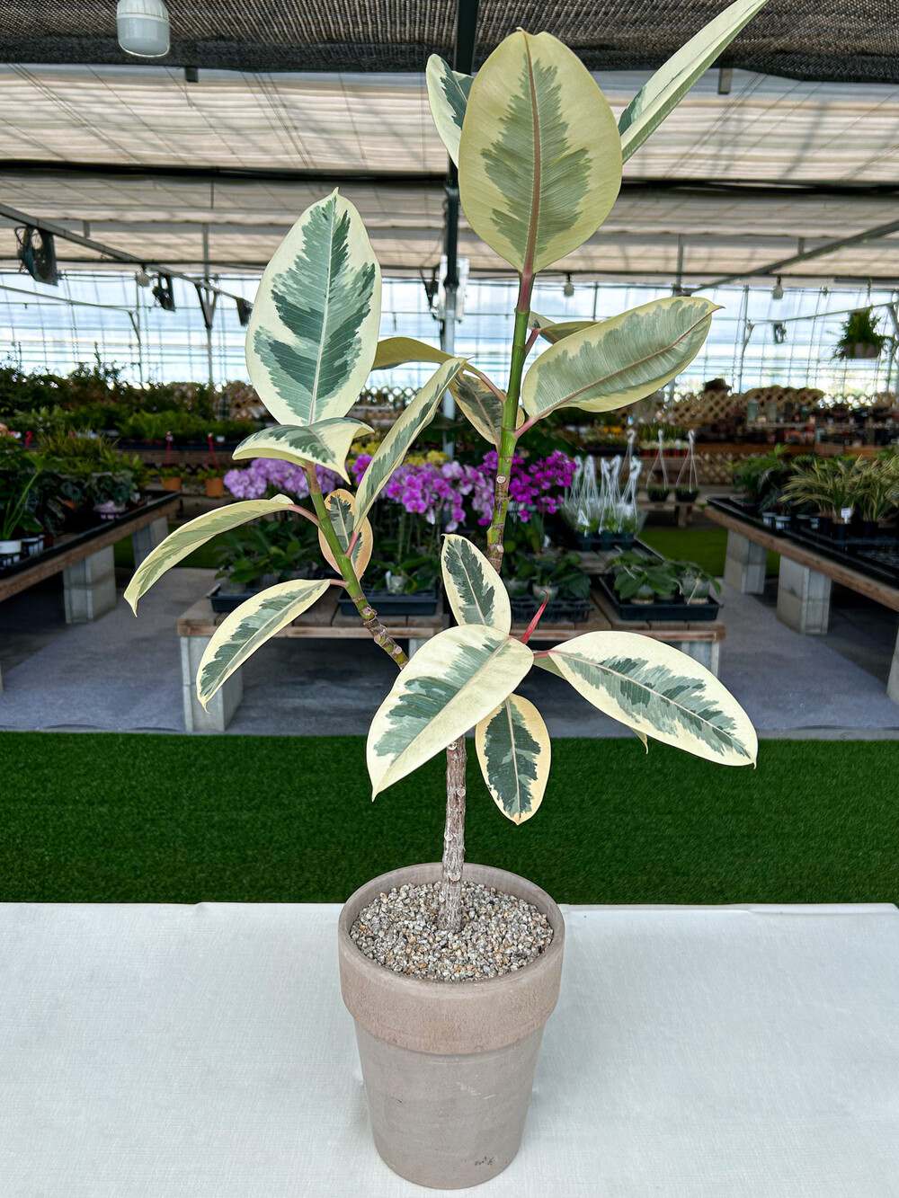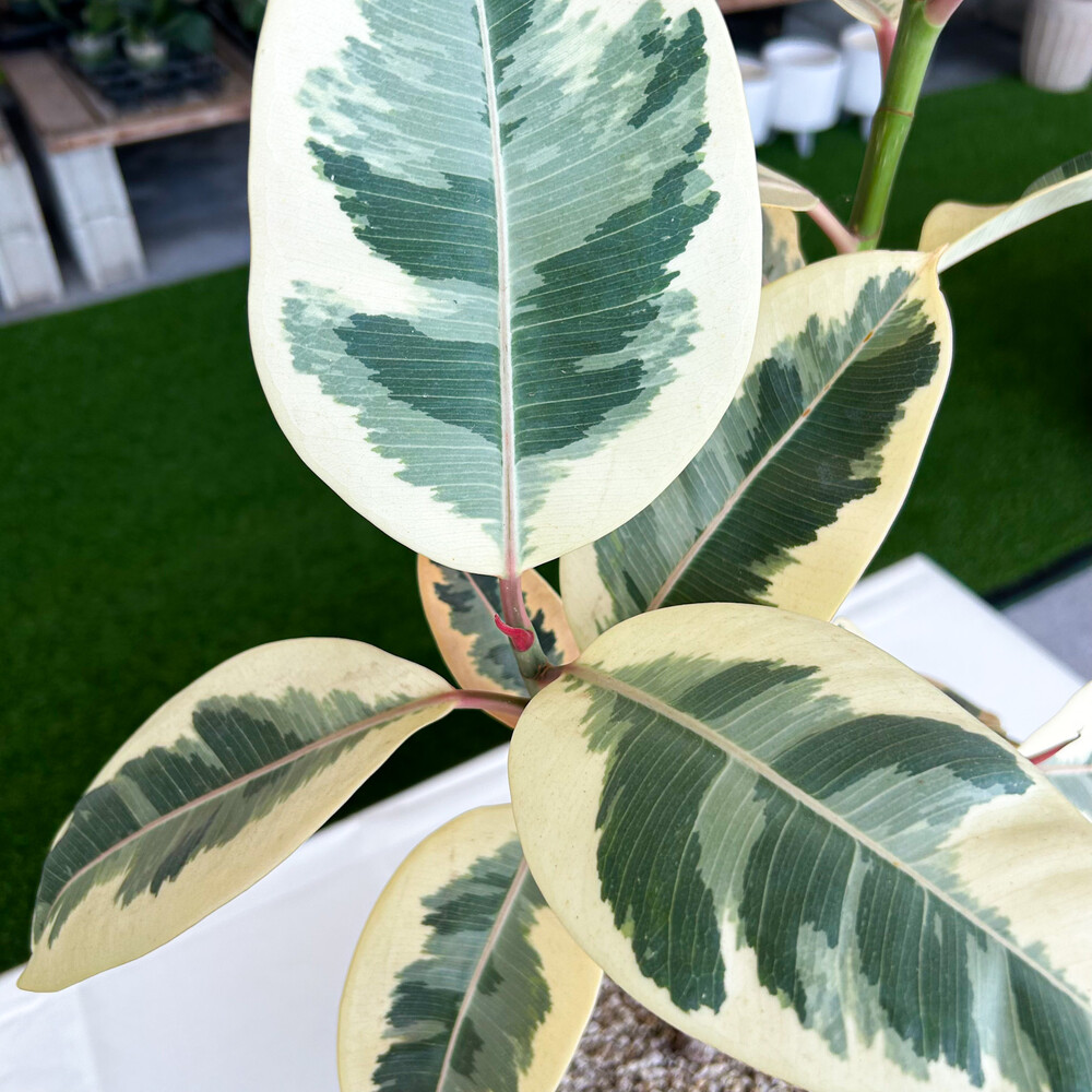 [뱅갈고무나무의 한 종류로 잎이 수채화물감이 번지듯 한 무늬가 특징이며 인테리어 식물로 인기가 많습니다.]